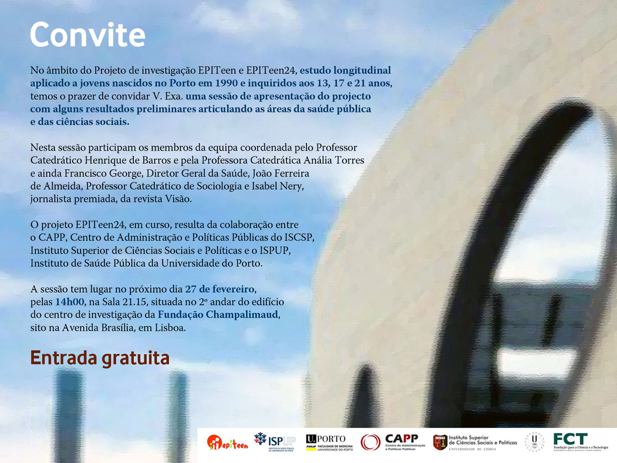 Organização de uma sessão pública de apresentação e resultados preliminares do projecto “EPITeen24: Reproduzir ou contrariar o destino social? Estudo longitudinal de uma geração nascida nos anos 90 do século XX em Portugal”